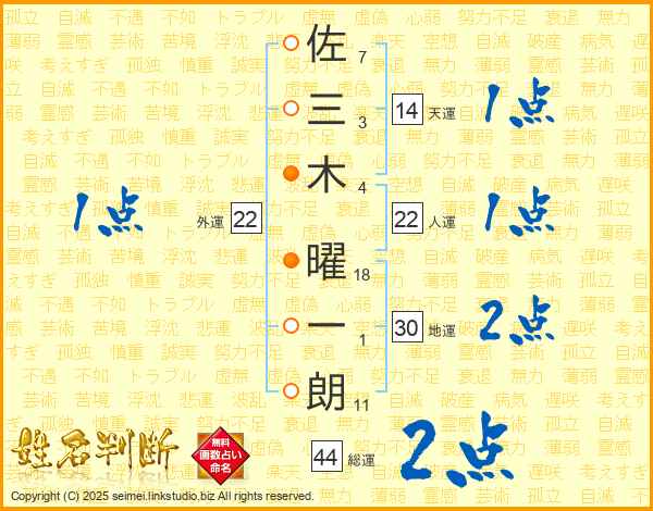佐(7画)三(3画)木(4画) 曜(18画)一(1画)朗(11画)