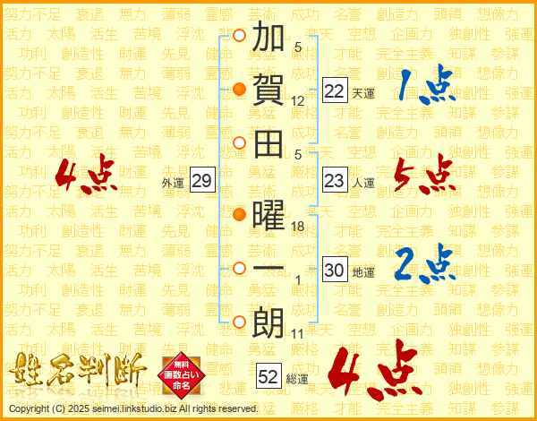 加(5画)賀(12画)田(5画) 曜(18画)一(1画)朗(11画)