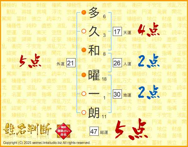 多久和曜一朗さんの総運は47画の5点!