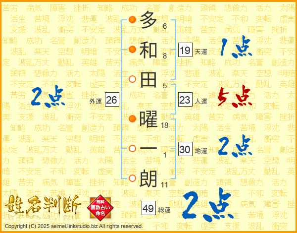あなたの人生を表す1番重要な運勢です。生涯を通じて影響する総合運となり、主に50歳以降の晩年期に影響を及ぼします。苗字と名前の合計画数。