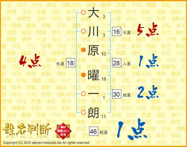 大(3画)川(3画)原(10画) 曜(18画)一(1画)朗(11画)