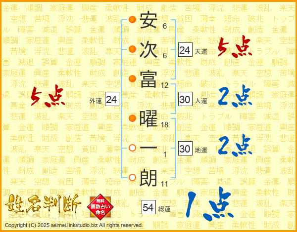 安(6画)次(6画)富(12画) 曜(18画)一(1画)朗(11画)
