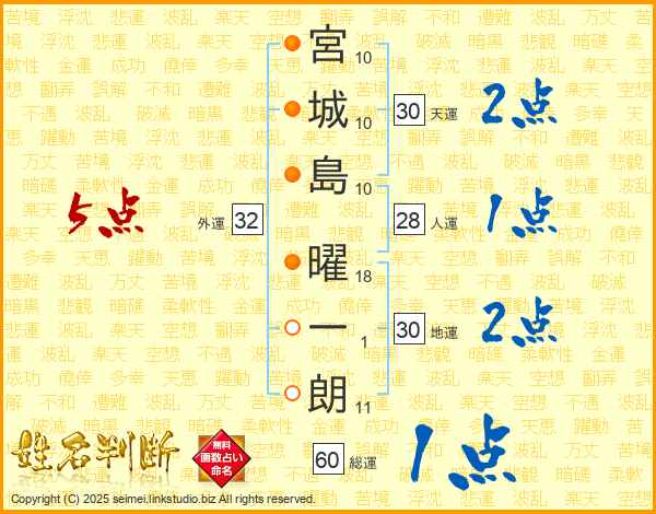 宮(10画)城(10画)島(10画) 曜(18画)一(1画)朗(11画)