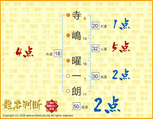 寺(6画)嶋(14画) 曜(18画)一(1画)朗(11画)