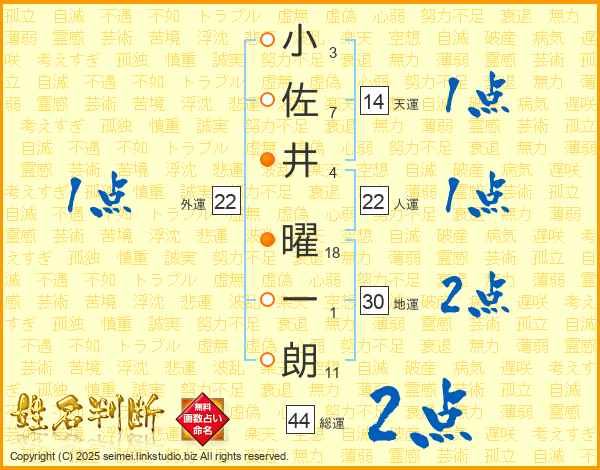 小(3画)佐(7画)井(4画) 曜(18画)一(1画)朗(11画)