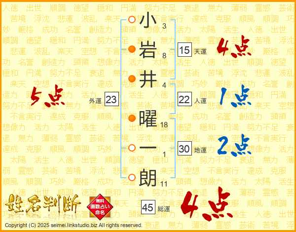 小(3画)岩(8画)井(4画) 曜(18画)一(1画)朗(11画)