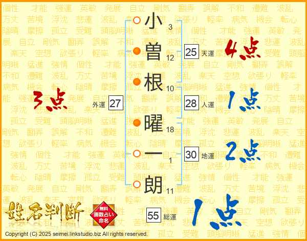 小(3画)曽(12画)根(10画) 曜(18画)一(1画)朗(11画)