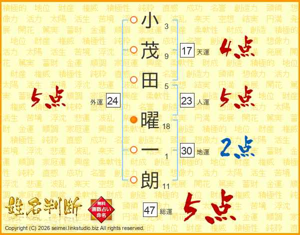 小(3画)茂(9画)田(5画) 曜(18画)一(1画)朗(11画)