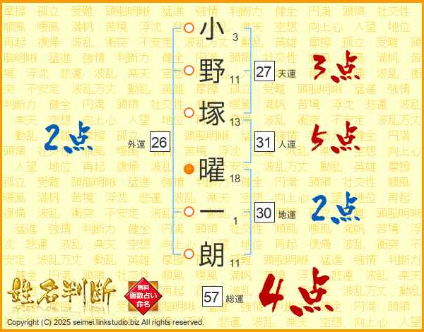 小(3画)野(11画)塚(13画) 曜(18画)一(1画)朗(11画)