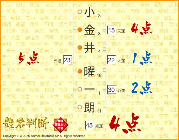 小(3画)金(8画)井(4画) 曜(18画)一(1画)朗(11画)