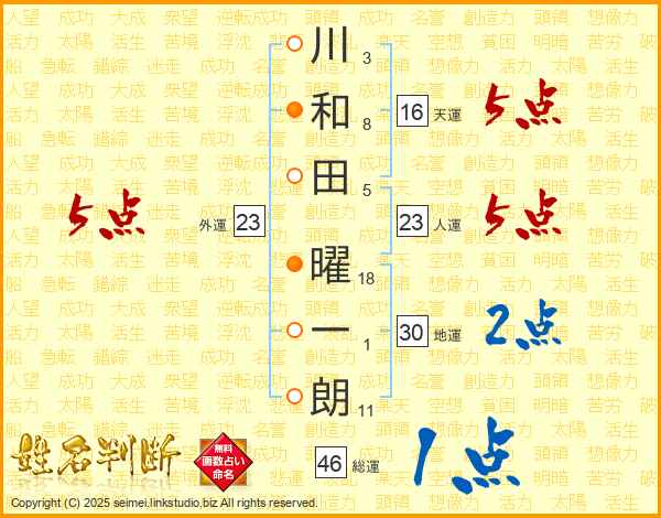 川(3画)和(8画)田(5画) 曜(18画)一(1画)朗(11画)