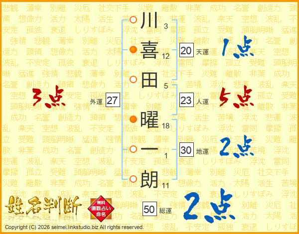 川(3画)喜(12画)田(5画) 曜(18画)一(1画)朗(11画)