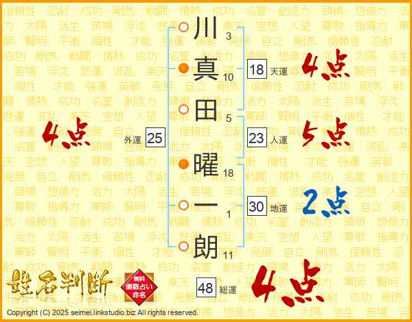 川(3画)真(10画)田(5画) 曜(18画)一(1画)朗(11画)