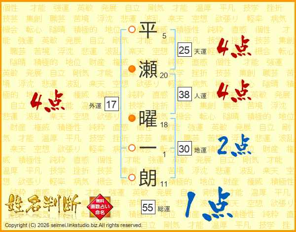 平(5画)瀬(20画) 曜(18画)一(1画)朗(11画)