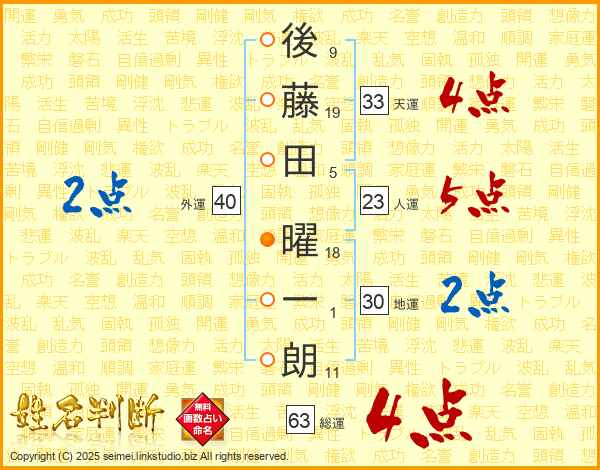 後(9画)藤(19画)田(5画) 曜(18画)一(1画)朗(11画)