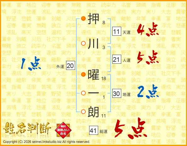 押(8画)川(3画) 曜(18画)一(1画)朗(11画)