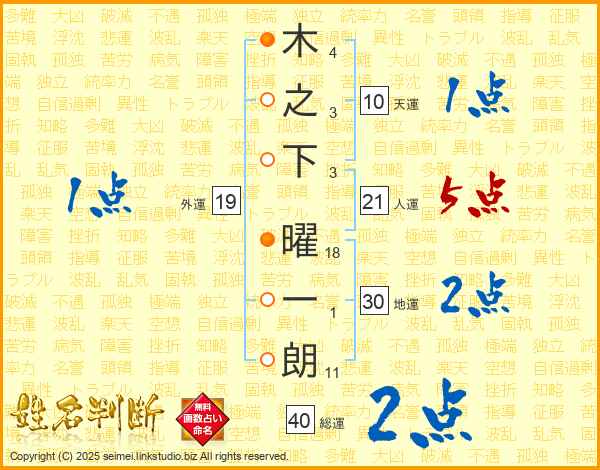 木(4画)之(3画)下(3画) 曜(18画)一(1画)朗(11画)