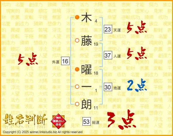 木(4画)藤(19画) 曜(18画)一(1画)朗(11画)