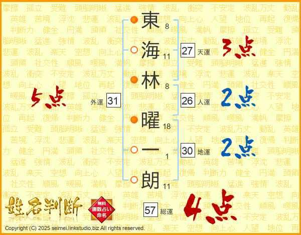 東(8画)海(11画)林(8画) 曜(18画)一(1画)朗(11画)