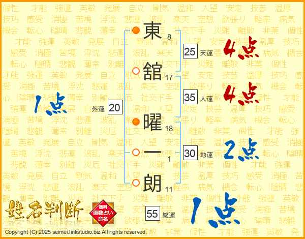 東(8画)舘(17画) 曜(18画)一(1画)朗(11画)