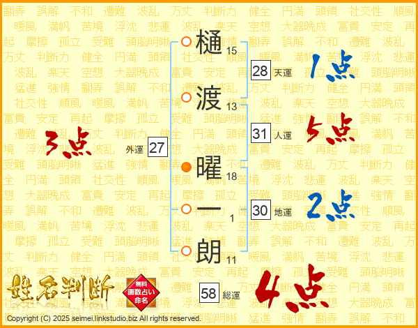 樋(15画)渡(13画) 曜(18画)一(1画)朗(11画)
