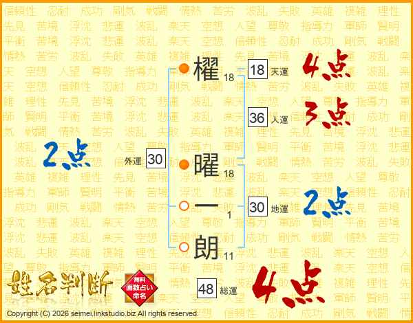 櫂(18画) 曜(18画)一(1画)朗(11画)