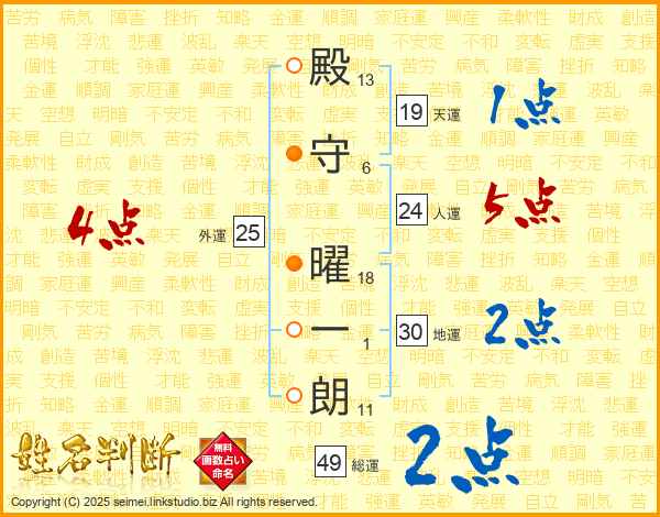 殿(13画)守(6画) 曜(18画)一(1画)朗(11画)
