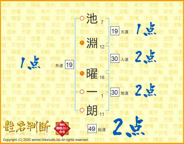 池(7画)淵(12画) 曜(18画)一(1画)朗(11画)