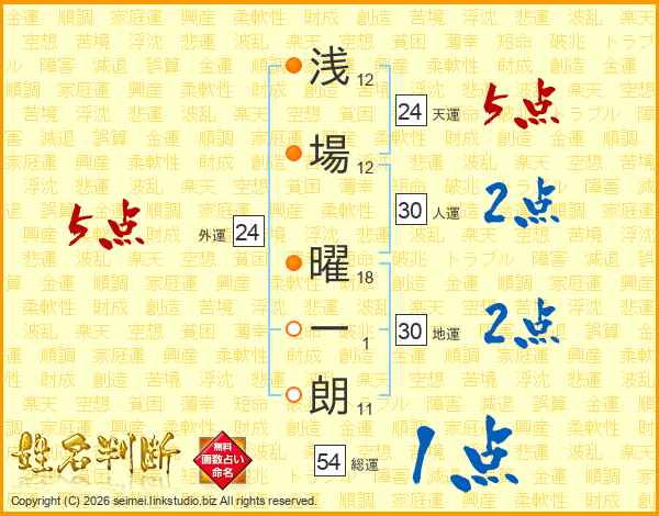 浅(12画)場(12画) 曜(18画)一(1画)朗(11画)