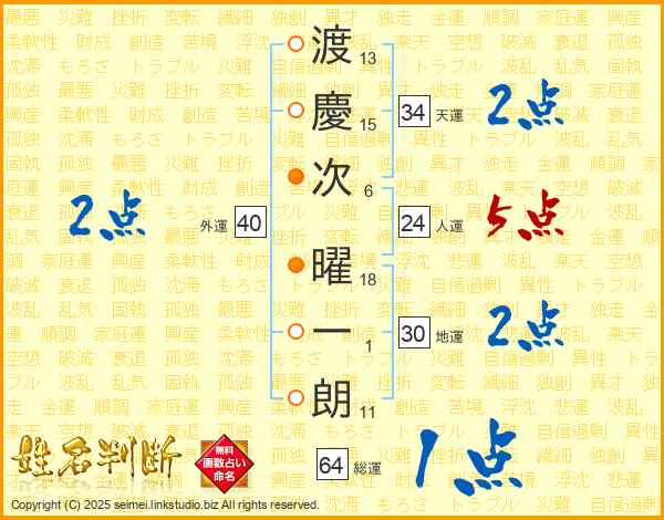 渡(13画)慶(15画)次(6画) 曜(18画)一(1画)朗(11画)