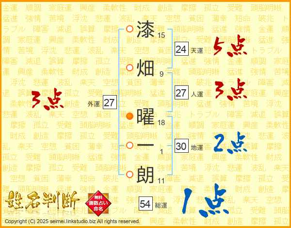 漆(15画)畑(9画) 曜(18画)一(1画)朗(11画)