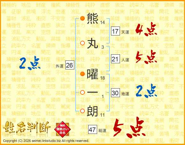 熊(14画)丸(3画) 曜(18画)一(1画)朗(11画)