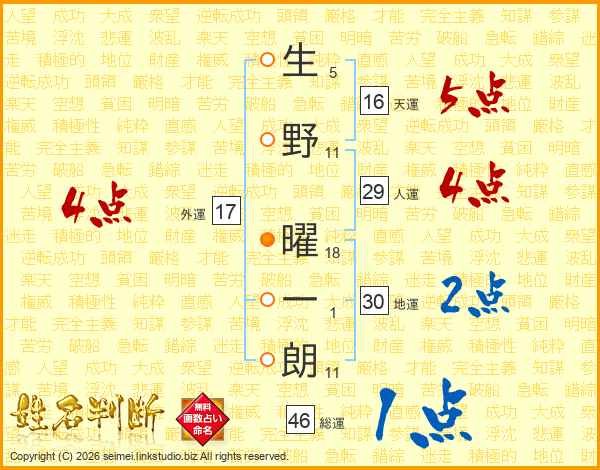 生(5画)野(11画) 曜(18画)一(1画)朗(11画)