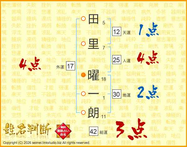 田(5画)里(7画) 曜(18画)一(1画)朗(11画)