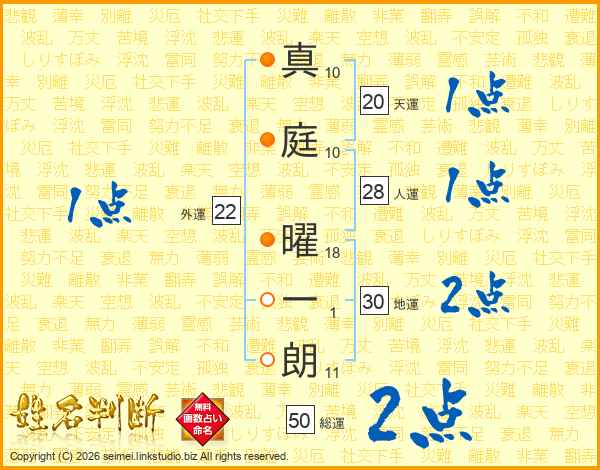 真(10画)庭(10画) 曜(18画)一(1画)朗(11画)