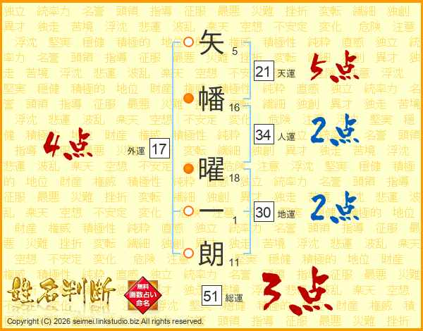 矢(5画)幡(16画) 曜(18画)一(1画)朗(11画)