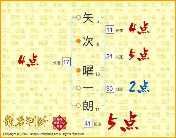 矢(5画)次(6画) 曜(18画)一(1画)朗(11画)