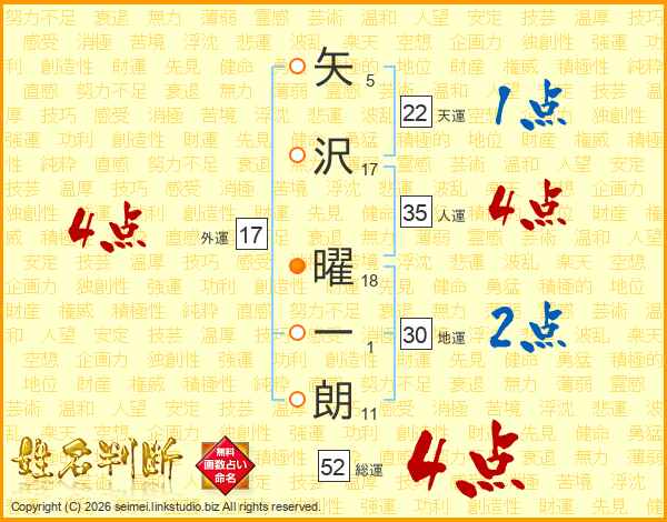 矢(5画)沢(17画) 曜(18画)一(1画)朗(11画)