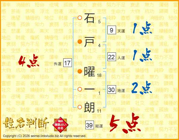 石(5画)戸(4画) 曜(18画)一(1画)朗(11画)