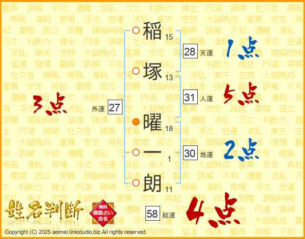 稲(15画)塚(13画) 曜(18画)一(1画)朗(11画)