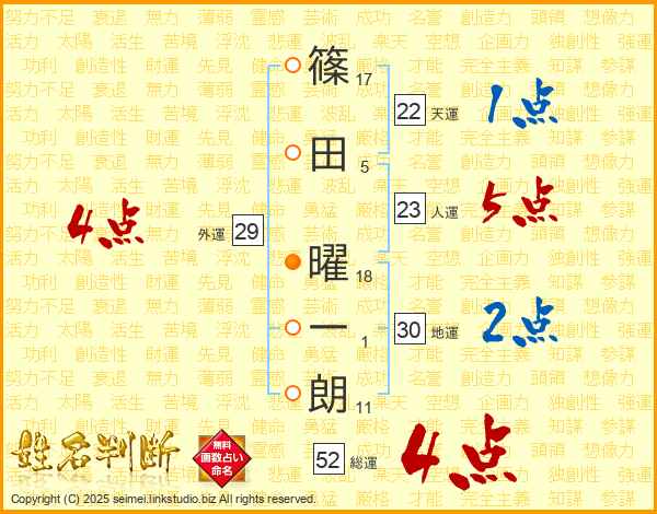 篠田曜一朗さんの総運は52画の4点!