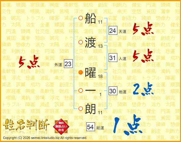 船(11画)渡(13画) 曜(18画)一(1画)朗(11画)