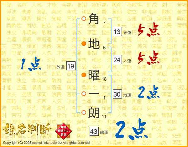 生活面を象徴する運勢です。外部から受ける影響力を表し、結婚運、家庭運や職場、環境への順応性を表します。総運から人運を引いた画数。姓や名が1文字の場合を除く。