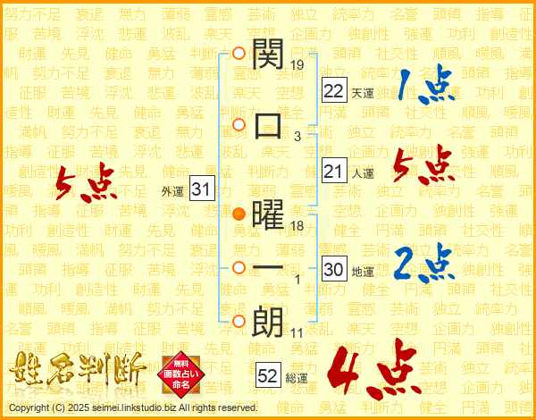 関(19画)口(3画) 曜(18画)一(1画)朗(11画)