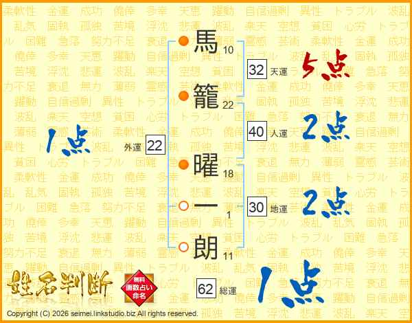 馬(10画)籠(22画) 曜(18画)一(1画)朗(11画)