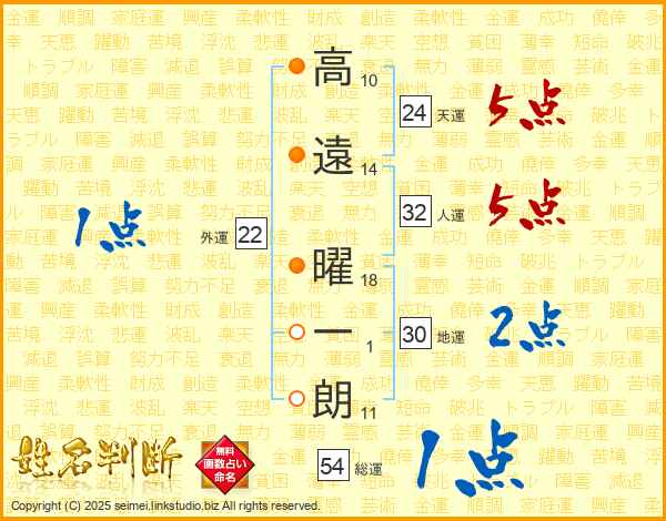 高(10画)遠(14画) 曜(18画)一(1画)朗(11画)