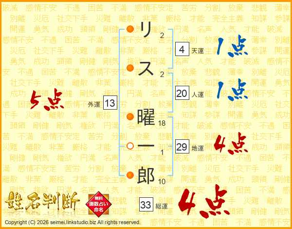 リ(2画)ス(2画) 曜(18画)一(1画)郎(10画)