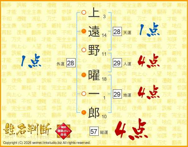 上(3画)遠(14画)野(11画) 曜(18画)一(1画)郎(10画)