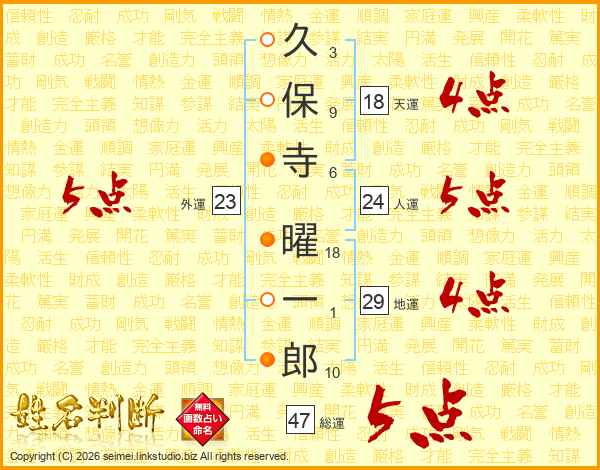 久(3画)保(9画)寺(6画) 曜(18画)一(1画)郎(10画)