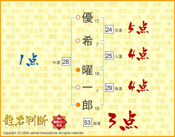 優(17画)希(7画) 曜(18画)一(1画)郎(10画)